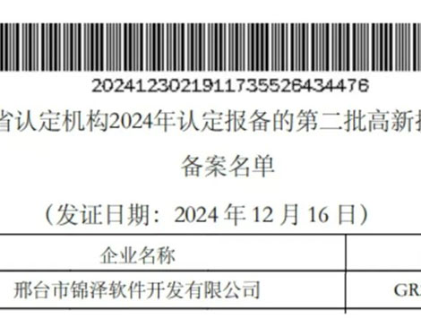 喜報(bào)丨熱烈祝賀邢臺市錦澤軟件開發(fā)有限公司獲評2024年度“國家高新技術(shù)企業(yè)”認(rèn)定